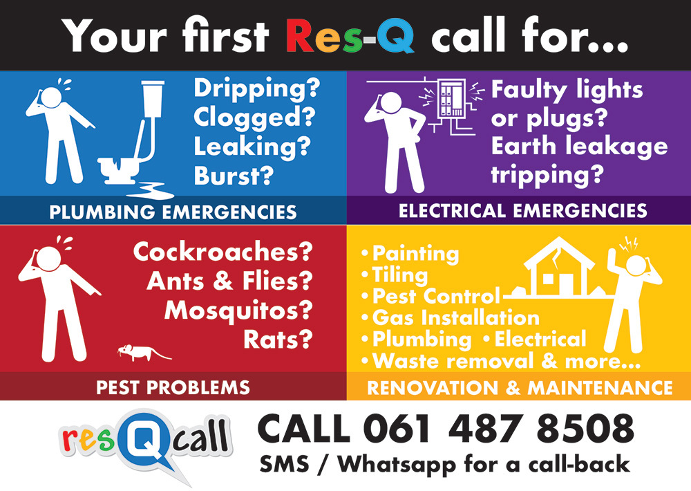 • Res-Q-Pro Use a Pro for home renovations, maintenance & emergencies * Construction *Plumbing *Electrical*Painting*Tiling*Gas installation*Pest Control*Waste removal and more... Res-Q-call 061 487 8508 Res-Q-SMS\Whatsapp 061 487 8508 for a call back...
