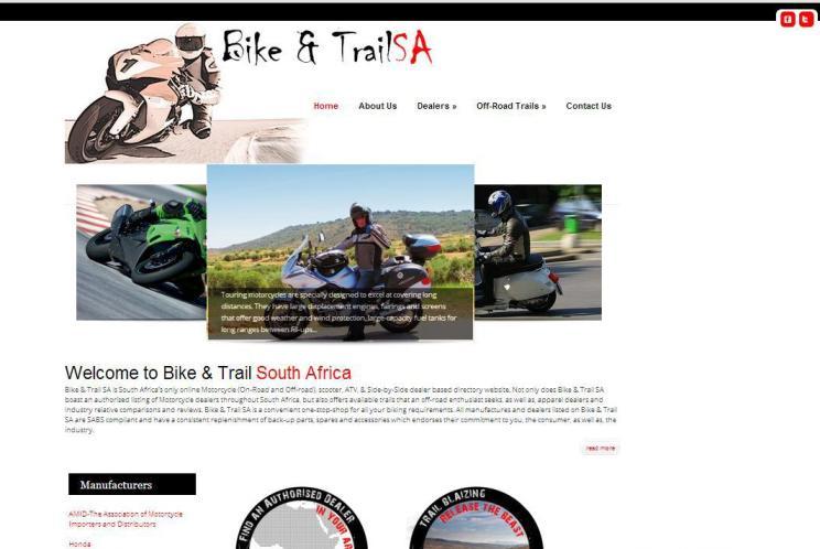 Bike & Trail SA is South Africa's only online Motorcycle (On-Road and Off-road), scooter, ATV, & Side-by-Side dealer based directory website. Not only does Bike & Trail SA boast an authorised listing of Motorcycle dealers throughout South Africa, but also offers available trails that an off-road enthusiast seeks, as well as, apparel dealers and industry relative comparisons and reviews. Bike & Trail SA is a convenient one-stop-shop for all your biking requirements. Quick links to manufacture web pages throughout our website provide an efficient means of attaining info at a click of a button. View our image slider on the homepage to keep you updated with manufacture and dealer promotions, expo's or events happening in and around your region. All manufactures and dealers listed on Bike & Trail SA are SABS compliant and have a consistent replenishment of back-up parts, spares and accessories which endorses their commitment to you, the consumer, as well as, the industry.